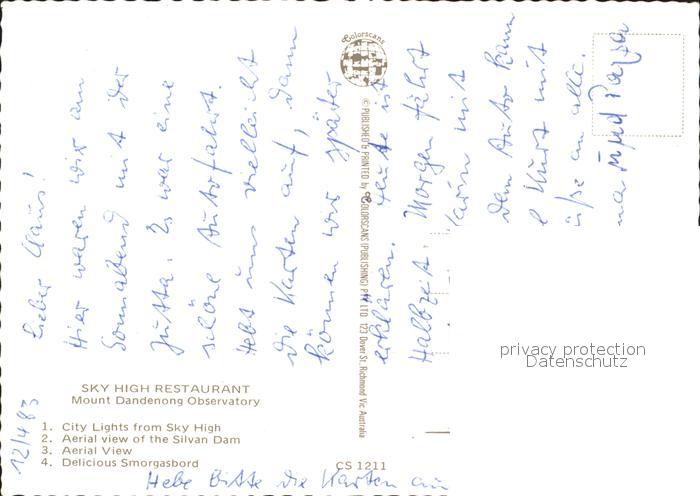old postcard Dandenong Sky High Restaurant City Lights Aerial view of the Silvan Dam Delicious Smorgasbord postalisch gelaufen Erhaltung siehe scans