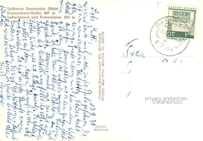 73620604 alte Postkarte Dannenfels Donnersberg Gipfel Ludwigsturm Fernsehturm Fliegeraufnahme postalisch gelaufen Erhaltung siehe scans [FriedD77] KatCode: 11110007333013