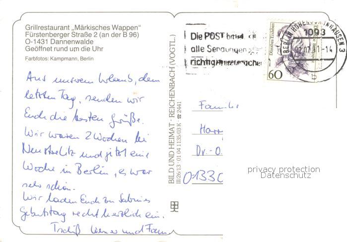 73659391 alte Postkarte Dannenwalde Gransee Restaurant M?rkisches Wappen postalisch gelaufen Erhaltung siehe scans [LiesaD40] KatCode: 11110012065100