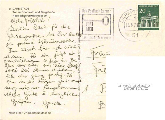 72721044 alte Postkarte Darmstadt Hessisches Landesmuseum Wasserspiele Tor zum Odenwald und Bergstrasse postalisch gelaufen Erhaltung siehe scans [FriedD77] KatCode: 11110006411000