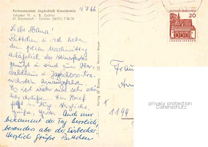 72844879 alte Postkarte Darmstadt Park-Restaurant Jagdschloss Kranichstein postalisch gelaufen Erhaltung siehe scans [LiesaD40] KatCode: 11110006411000