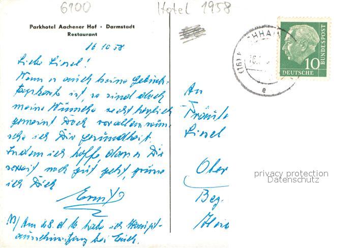 73698493 alte Postkarte Darmstadt Parkhotel Aachener Hof Restaurant postalisch gelaufen Erhaltung siehe scans [FriedD77] KatCode: 11110006411000