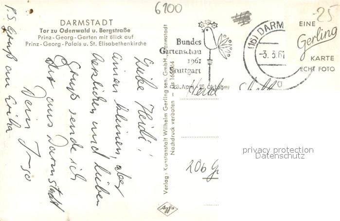 73698031 alte Postkarte Darmstadt Prinz Georg Garten mit Blick auf Prinz Georg Palais und St. Elisabethenkirche Stempel Bundesgartenschau postalisch gelaufen Erhaltung siehe scans [FriedD77] KatCode: 11110006411000