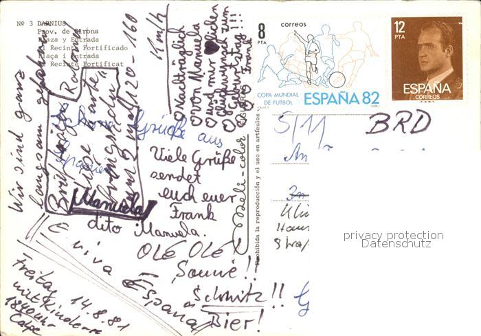 old postcard Darnius Plaza y Entrada al Recinto Fortificado postalisch gelaufen Erhaltung siehe scans