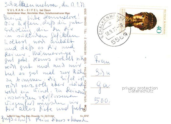72942617 alte Postkarte Daun Eifel Fliegeraufnahme Gem?ndener-Maar Weinfelder-Maar Schalkenmehrener-Maar postalisch gelaufen Erhaltung siehe scans [LiesaD40] KatCode: 11110007233501
