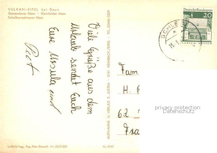 73179489 alte Postkarte Daun Eifel Fliegeraufnahme Gemuendener Weinfelder Schalkenmerener Maare postalisch gelaufen Erhaltung siehe scans [KathaD81] KatCode: 11110007233501