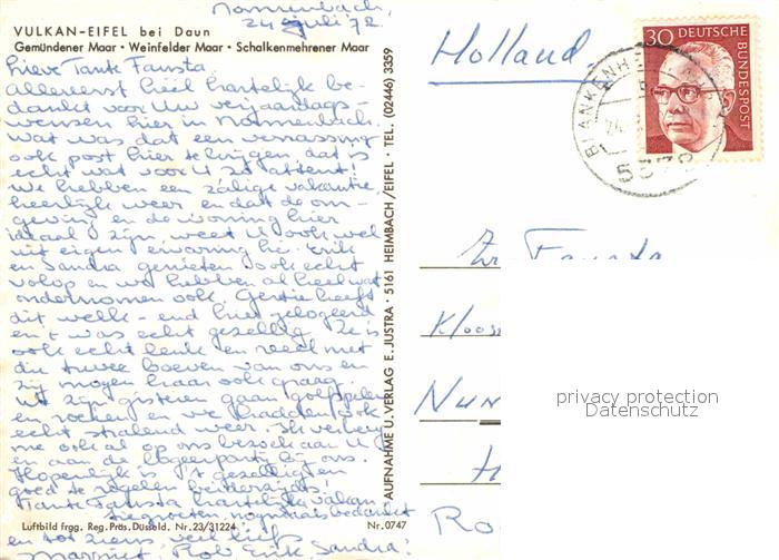 72863620 alte Postkarte Daun Eifel Gemuendener Maar Weinfelder Maar Schalkenmehrener Maar Fliegeraufnahme postalisch gelaufen Erhaltung siehe scans [FriedD77] KatCode: 11110007233501