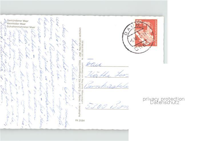 71850842 alte Postkarte Daun Eifel Gemuendener Maar Weinfelder Maar Schalkenmehrener Maar Fliegeraufnahme postalisch gelaufen Erhaltung siehe scans KatCode: 11110007233501