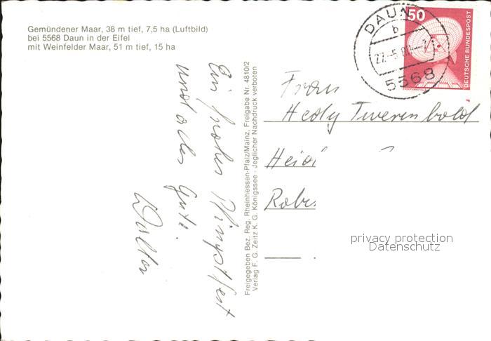 72528113 alte Postkarte Daun Eifel Gemuendener und Weinfelder Maar Fliegeraufnahme postalisch gelaufen Erhaltung siehe scans KatCode: 11110007233501
