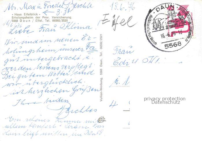 74100693 alte Postkarte Daun Vulkaneifel Erholungsheim Haus Eifelblick Restaurant Hallenbad Landschaftspanorama postalisch gelaufen Erhaltung siehe scans [FriedD77] KatCode: 11110007233501