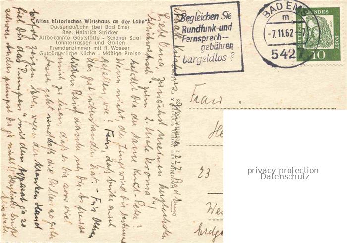 74038665 alte Postkarte Dausenau Rheinland-Pfalz Altes historisches Wirtshaus an der Lahn Gaststube Stadttor Liedtext von der Wirtin an der Lahn postalisch gelaufen Erhaltung siehe scans [WerneD78] KatCode: 11110007141025