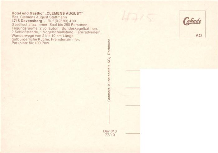 73896566 Davensberg Ascheberg Hotel Gasthof Clemens August Restaurant Kegelbahn postalisch nicht gelaufen Erhaltung siehe scans [FriedD77] KatCode: 11110005558004