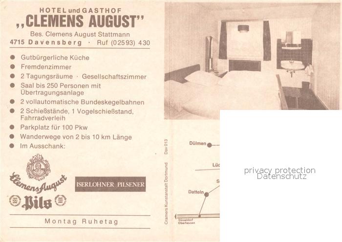73641024 Davensberg Hotel Gasthof Clemens August Gastraeume Kegelbahn Bar postalisch nicht gelaufen Werbekarte (keine Postkarte) Erhaltung siehe scans [WerneD78] KatCode: 11110005558004