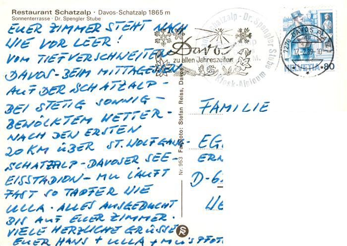 13881095 alte Postkarte Davos GR Restaurant Schatzalp Sonnenterrasse Dr Spengler Stube postalisch gelaufen Erhaltung siehe scans [WerneD78] KatCode: 11470100350342