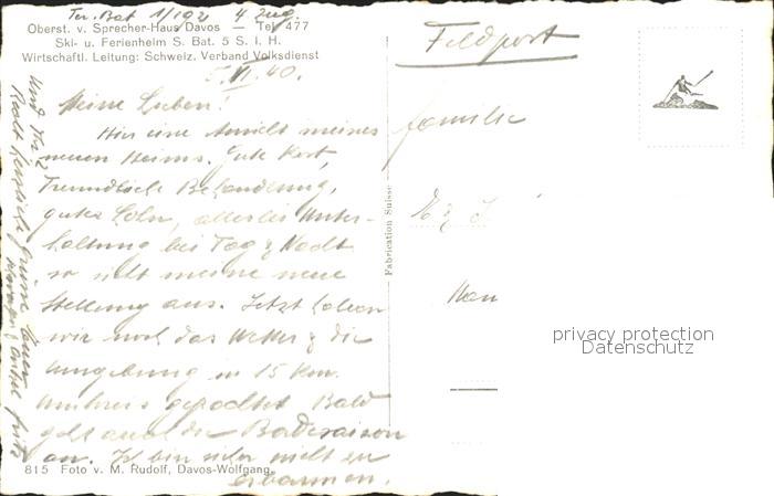 11634190 alte Postkarte Davos GR Ski- und Ferienheim Oberst von Sprecher-Haus postalisch gelaufen Feldpost Erhaltung siehe scans KatCode: 11470100350342