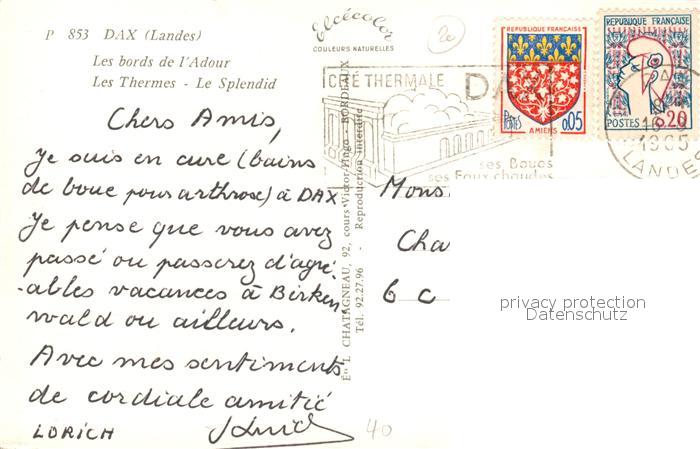 13503802 carte postale Dax Landes Bords de l’Adour Les Thermes et le Splendid postalisch gelaufen Erhaltung siehe scans [FriedD77] KatCode: 11170040140088