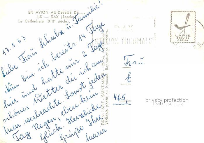 12720011 carte postale Dax Landes Cathedrale Fliegeraufnahme postalisch gelaufen Erhaltung siehe scans [NatalD47] KatCode: 11170040140088