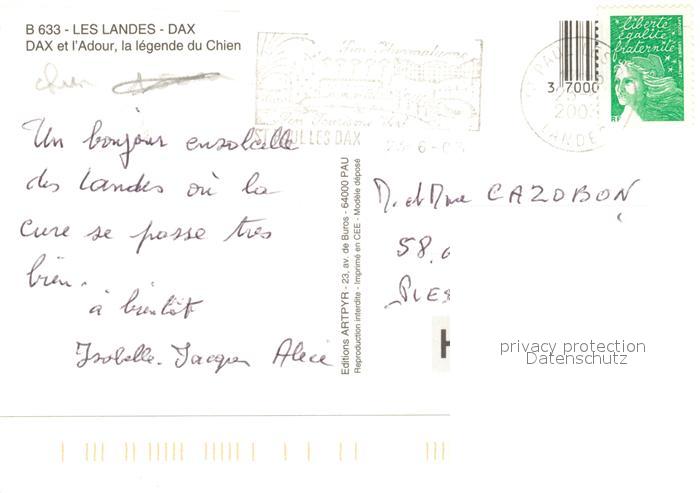 13266721 carte postale Dax Landes et l’Adour la légende du Chien postalisch gelaufen Erhaltung siehe scans [FriedD77] KatCode: 11170040140088