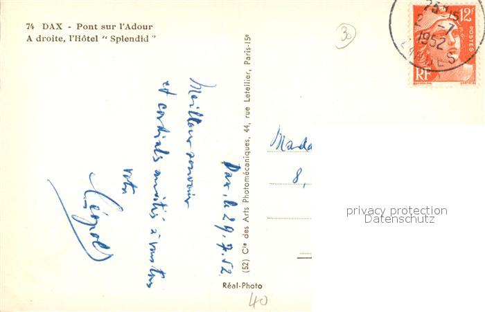 13504099 carte postale Dax Landes Pont sur l’Adour Hotel Splendid postalisch gelaufen Erhaltung siehe scans [FriedD77] KatCode: 11170040140088