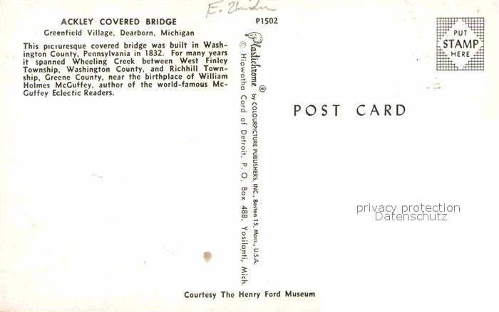 72907153 Dearborn Michigan Ackley Covered Bridge postalisch nicht gelaufen Erhaltung siehe scans [NatalD47] KatCode: 14140240000000