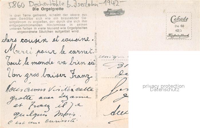 73700114 Dechenhoehle Iserlohn Orgelgrotte postalisch nicht gelaufen Erhaltung siehe scans [LiesaD40] KatCode: 11110005962024