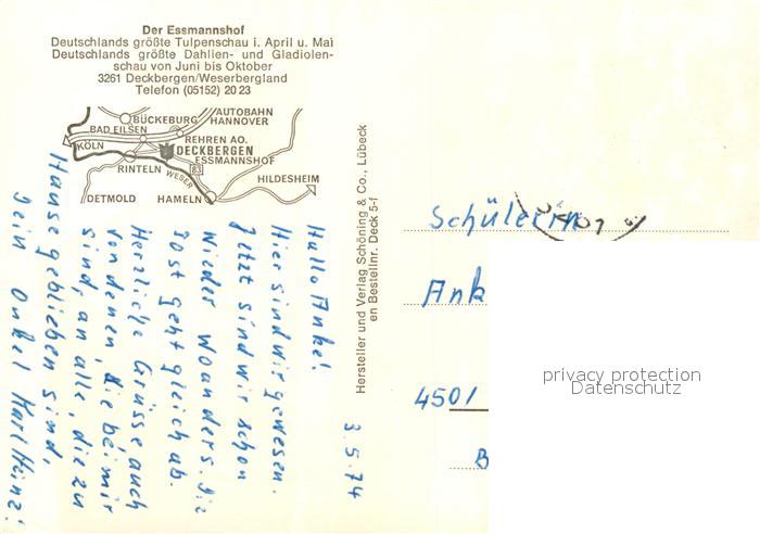 73123231 alte Postkarte Deckbergen Essmannshof Tulpenschau postalisch gelaufen Erhaltung siehe scans [LiesaD40] KatCode: 11110003257031