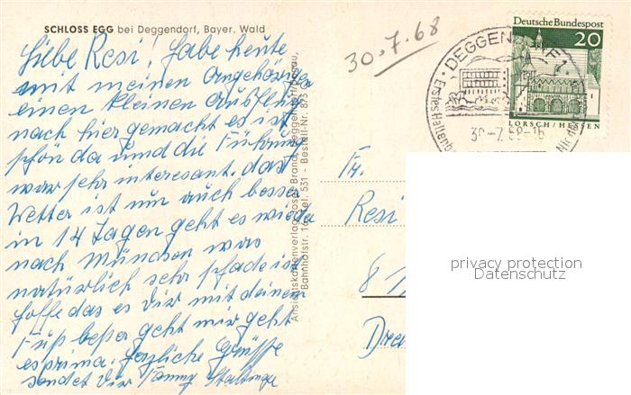 73072336 alte Postkarte Deggendorf Donau Schloss Egg postalisch gelaufen Erhaltung siehe scans [WerneD78] KatCode: 11110009271119