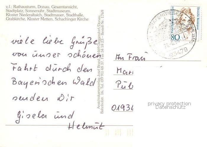 73171421 alte Postkarte Deggendorf Donau Stadtplatz Sonnenuhr Stadtmuseum Stadthalle Grabkirche postalisch gelaufen Erhaltung siehe scans [PaolaD17] KatCode: 11110009271119