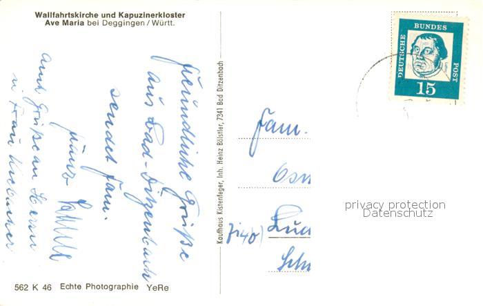 73744385 alte Postkarte Deggingen Wallfahrtskirche und Kapuzinerkloster Ave Maria postalisch gelaufen Erhaltung siehe scans [WerneD78] KatCode: 11110008117014