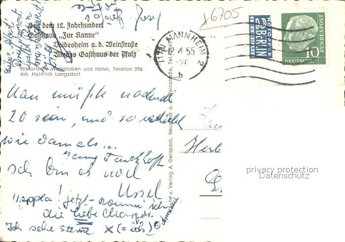 41793393 alte Postkarte Deidesheim Gasthaus zur Kanne Speisesaal postalisch gelaufen Erhaltung siehe scans KatCode: 11110007332009