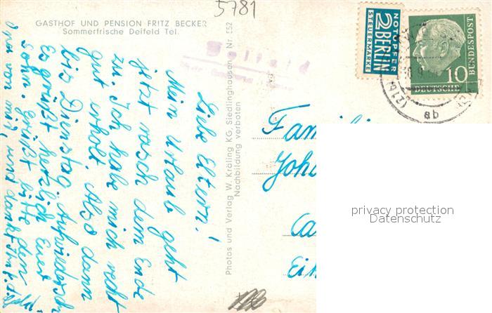 73695393 alte Postkarte Deifeld Gasthof Becker Kirche Blick auf den Ort Astenturm Ruhrquelle postalisch gelaufen Erhaltung siehe scans [WerneD78] KatCode: 11110005958028