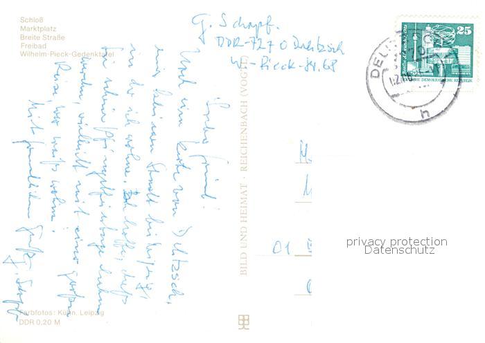 72972694 alte Postkarte Delitzsch Schloss Marktplatz Breite Strasse Freibad Wilhelm Pieck Gedenktafel postalisch gelaufen Erhaltung siehe scans [FriedD77] KatCode: 11110014374060