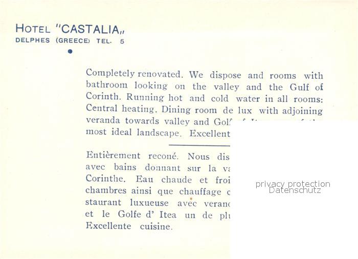 32983586 Delphes Delphi Hotel Castalia postalisch nicht gelaufen Keine Postkarte (siehe scan) Erhaltung siehe scans [NatalD47] KatCode: 11190