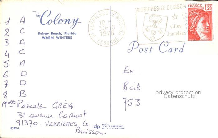 72054941 old postcard Delray Beach The Colony Motel Swimming Pool postalisch gelaufen Erhaltung siehe scans KatCode: 14140110000000