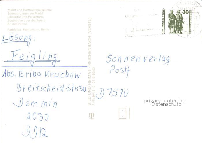 72416153 alte Postkarte Demmin Mecklenburg Vorpommern Markt Bartholomaeuskirche Springbrunnen Luisentor Pulverturm postalisch gelaufen Erhaltung siehe scans KatCode: 11110013052018
