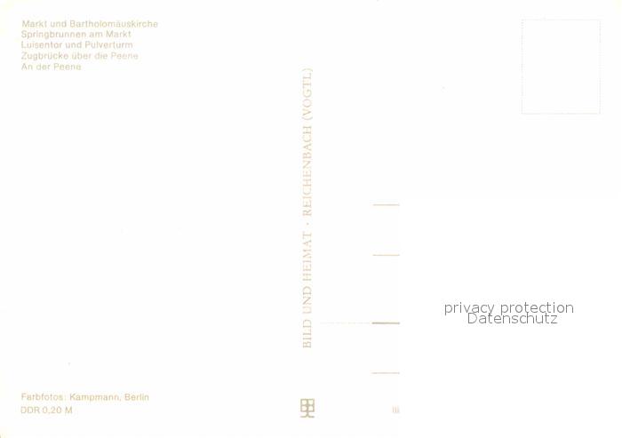 72829156 Demmin Mecklenburg Vorpommern Markt Bartholomaeuskirche Springbrunnen Luisentor Pulverturm Zugbruecke Peene postalisch nicht gelaufen Erhaltung siehe scans [FriedD77] KatCode: 11110013052018