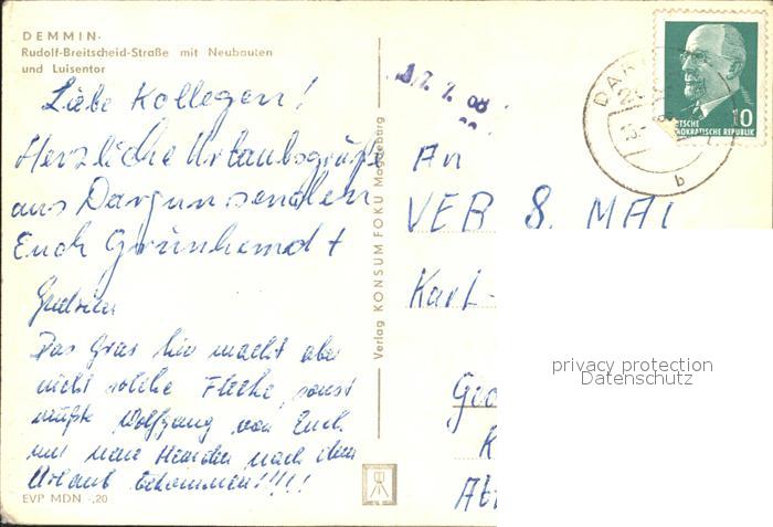 72008305 alte Postkarte Demmin Mecklenburg Vorpommern Rudolf Breitscheid Strasse mit Luisentor postalisch gelaufen Erhaltung siehe scans KatCode: 11110013052018