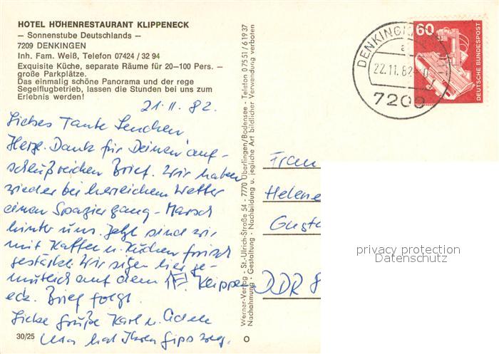 73719788 alte Postkarte Denkingen Wuerttemberg Hotel Hoehenrestaurant Klippeneck Sonnenstube Fliegeraufnahme postalisch gelaufen Erhaltung siehe scans [FriedD77] KatCode: 11110008327010