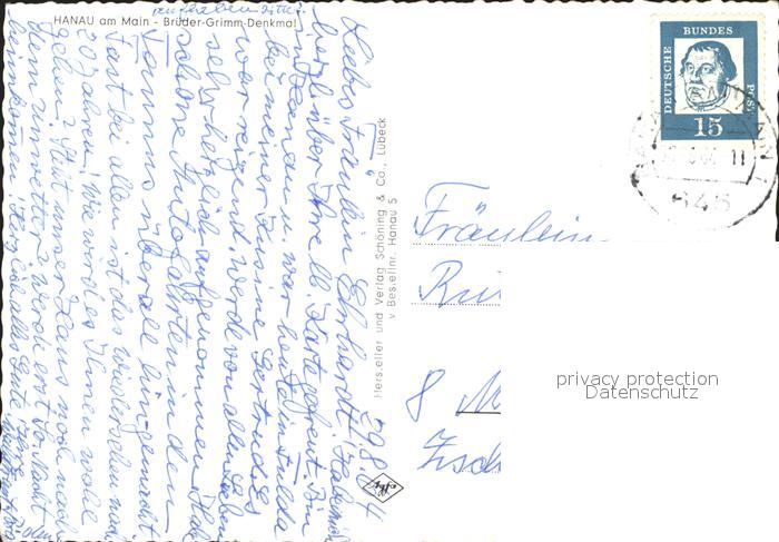 alte Postkarte Denkmal Brueder-Grimm Hanau am Main postalisch gelaufen