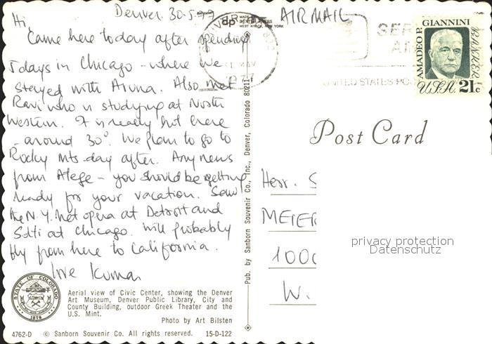 72279655 old postcard Denver City Fliegeraufnahme Civic-Center postalisch gelaufen Erhaltung siehe scans KatCode: 14140460000000