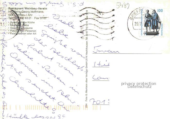 74054078 alte Postkarte Dernau Ahr Ahrweiler Rheinland-Pfalz Restaurant Weinbau-Verein Stadtansicht Teilansicht postalisch gelaufen Erhaltung siehe scans [FriedD77] KatCode: 11110007131017