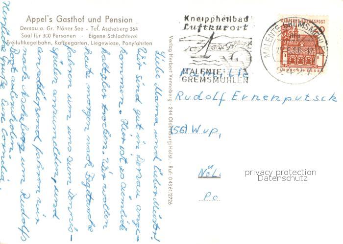 73681959 alte Postkarte Dersau Appel’s Gasthof Pension Saal Gaststube Kaffeegarten Badestrand Ploener See Motorboot Landkarte postalisch gelaufen Erhaltung siehe scans [FriedD77] KatCode: 11110001057015