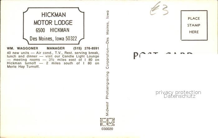 72232133 Des Moines Iowa Hickman Motor Lodge postalisch nicht gelaufen Erhaltung siehe scans KatCode: 14140170000000