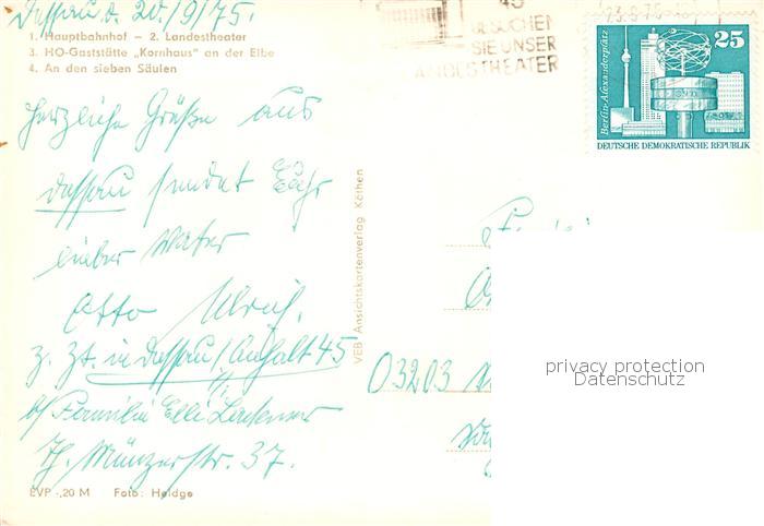 73870965 alte Postkarte Dessau-Rosslau Hauptbahnhof Landestheater HO Gaststaette Kornhaus an der Elbe An den sieben Saeulen postalisch gelaufen Erhaltung siehe scans [WerneD78] KatCode: 11110015001000