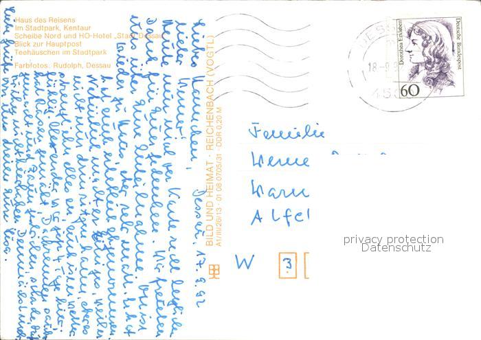 72416213 alte Postkarte Dessau-Rosslau Haus des Reisens Stadtpark Kentaur Hauptpost Teehaeuschen postalisch gelaufen Erhaltung siehe scans KatCode: 11110015001000