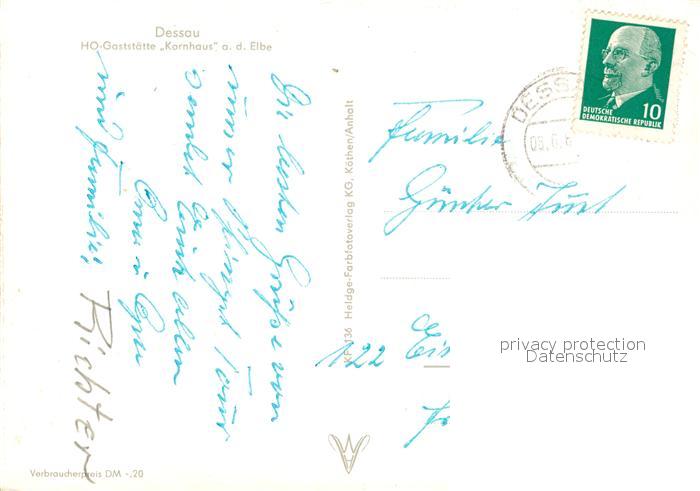 73305252 alte Postkarte Dessau-Rosslau HO Gaststaette Kornhaus an der Elbe postalisch gelaufen Erhaltung siehe scans [FriedD77] KatCode: 11110015001000