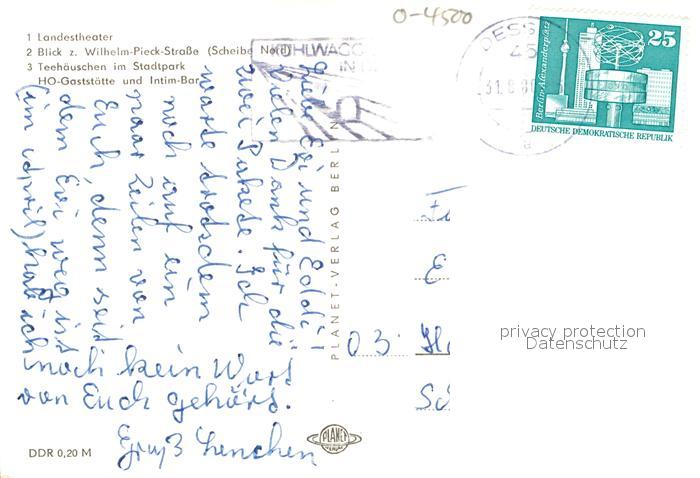 72984969 alte Postkarte Dessau-Rosslau Landestheater Wilhelm Pieck Strasse Teehaeuschen Stadtpark HOG und Intim Bar postalisch gelaufen Erhaltung siehe scans [WerneD78] KatCode: 11110015001000