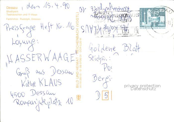 72455385 alte Postkarte Dessau-Rosslau Stadtpark Teehaeuschen Y- Haus postalisch gelaufen Erhaltung siehe scans KatCode: 11110015001000