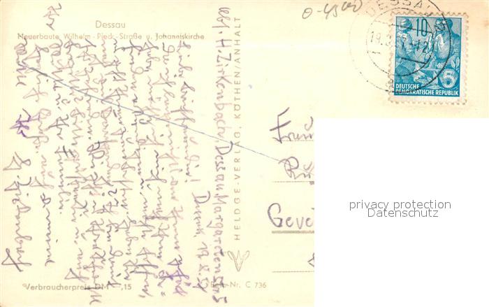 43497768 alte Postkarte Dessau-Rosslau Wilhelm Pieck Strasse Johanniskirche postalisch gelaufen Erhaltung siehe scans [KathaD81] KatCode: 11110015001000
