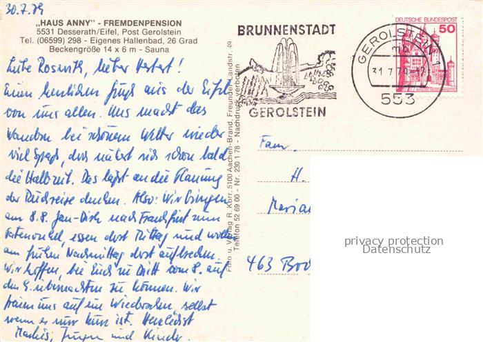 74021887 alte Postkarte Desserath Deudesfeld Haus Anny Fremdenpension Gastraum Hallenbad postalisch gelaufen Erhaltung siehe scans [FriedD77] KatCode: 11110007233017